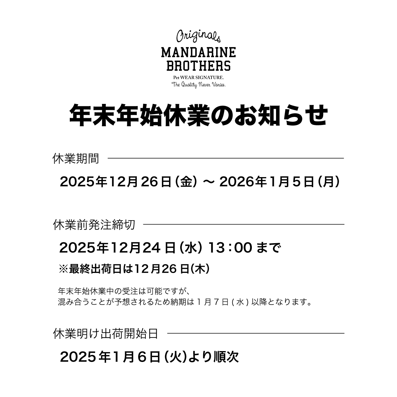 誠に勝手ながら2025年12月26日(金)~2026年1月5日(月)まで年末年始の休業とさせていただきます。 休業期間中はご不便をおかけいたしますが、何卒ご理解賜りますようお願い申し上げます。 共有:クリックして Twitter で共有 (新しいウィンドウで開きます)Facebook で共有するにはクリックしてください (新しいウィンドウで開きます)